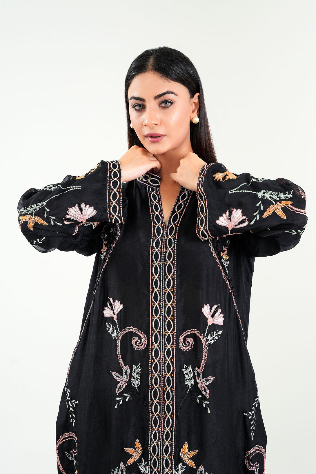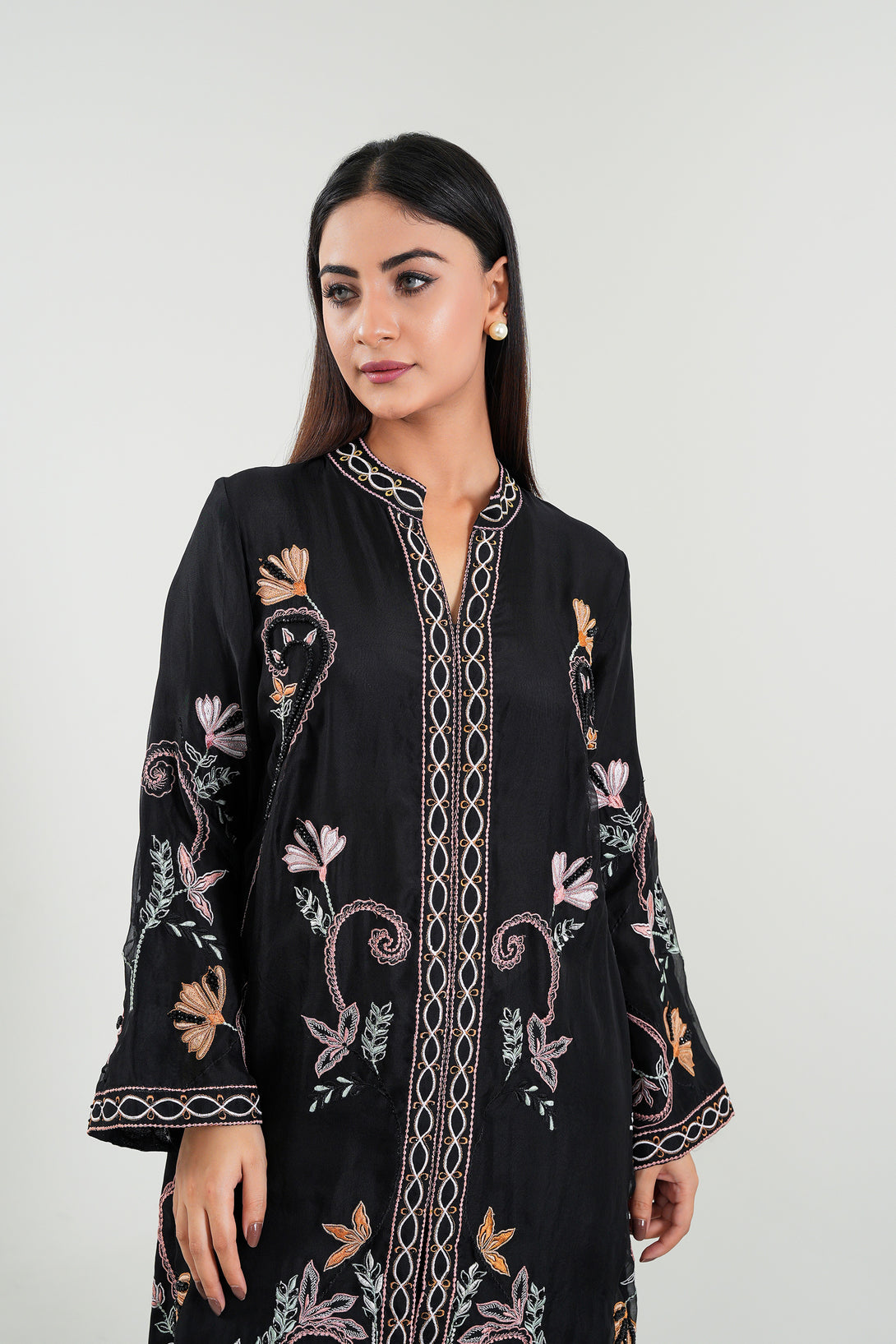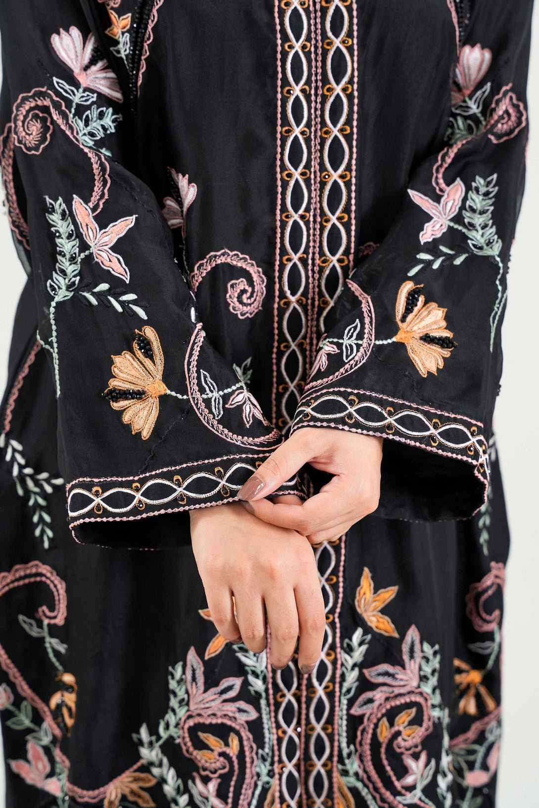 The ensemble features a rich black organza fabric,creating a luxurious base, further enhanced with delicate embroidery in delicate shades of pink and ochre, and handworked with crystals.