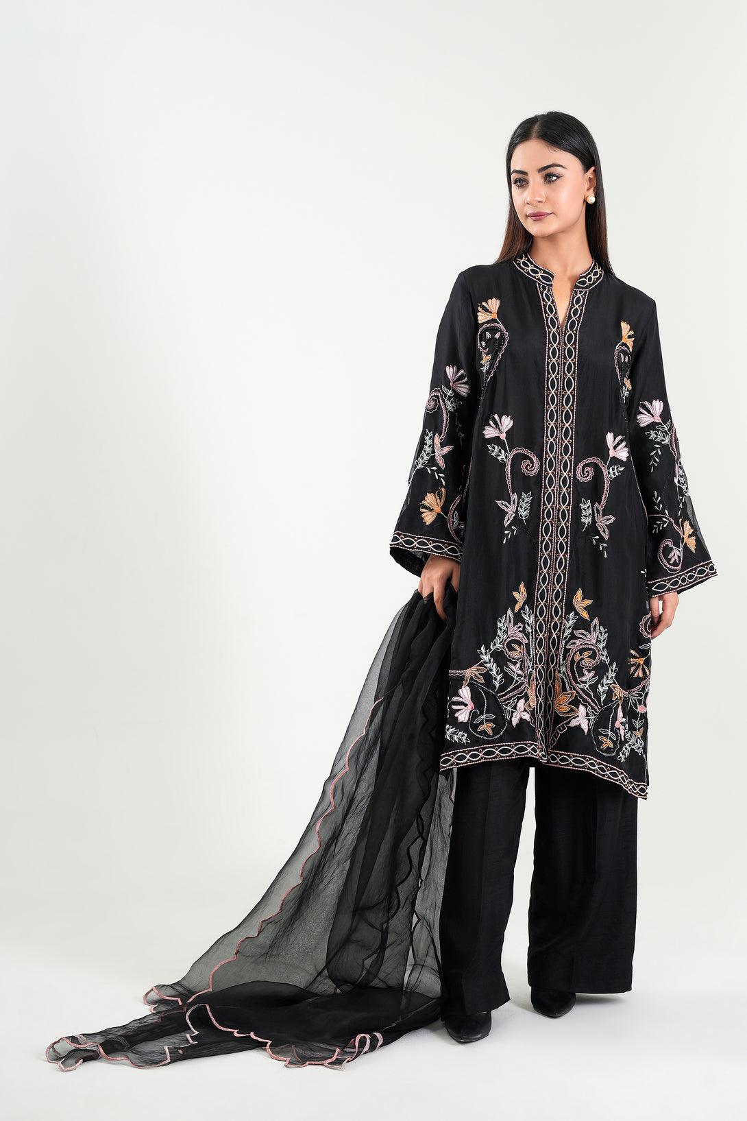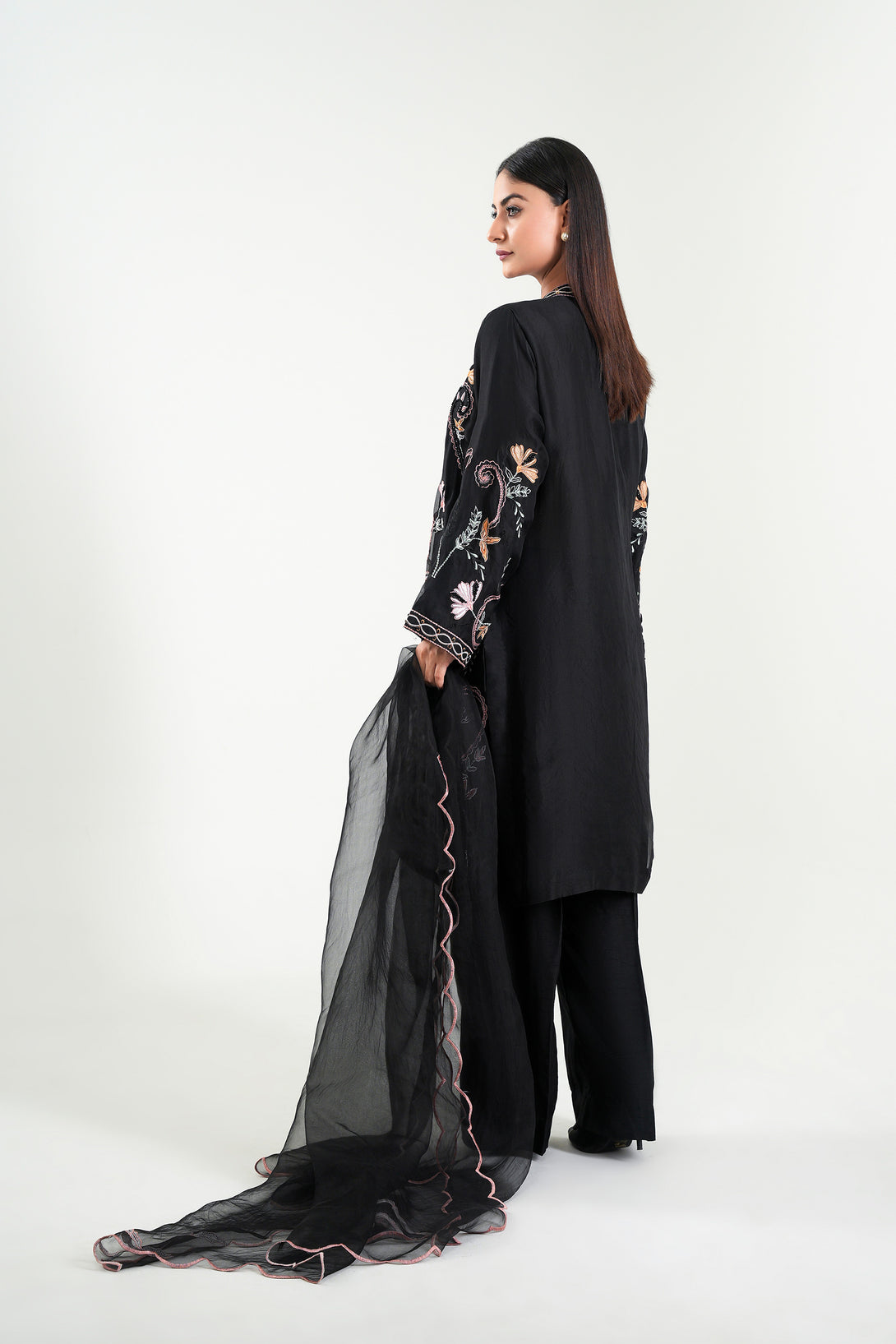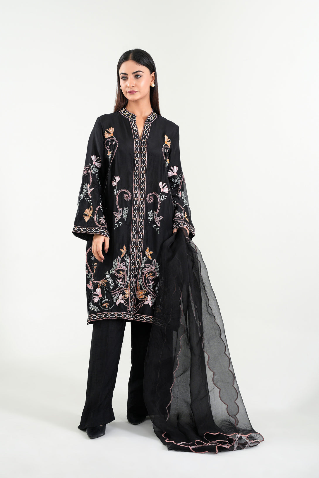 The ensemble features a rich black organza fabric,creating a luxurious base, further enhanced with delicate embroidery in delicate shades of pink and ochre, and handworked with crystals.