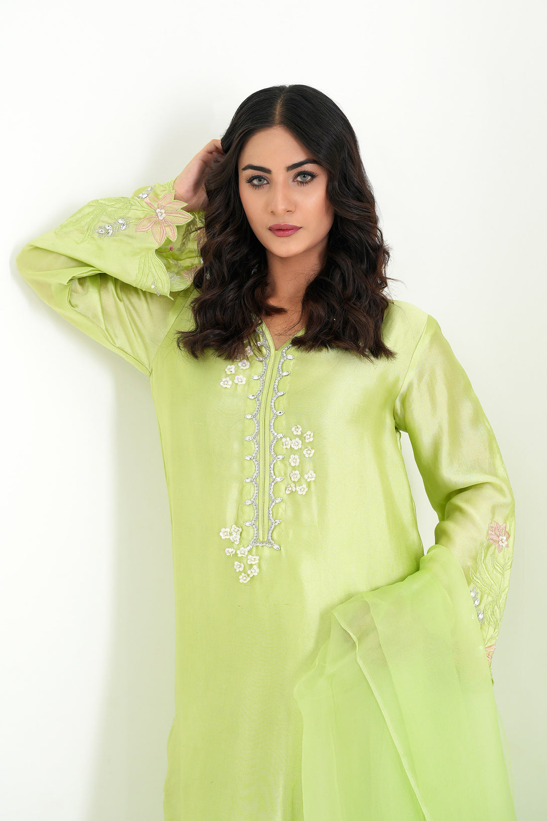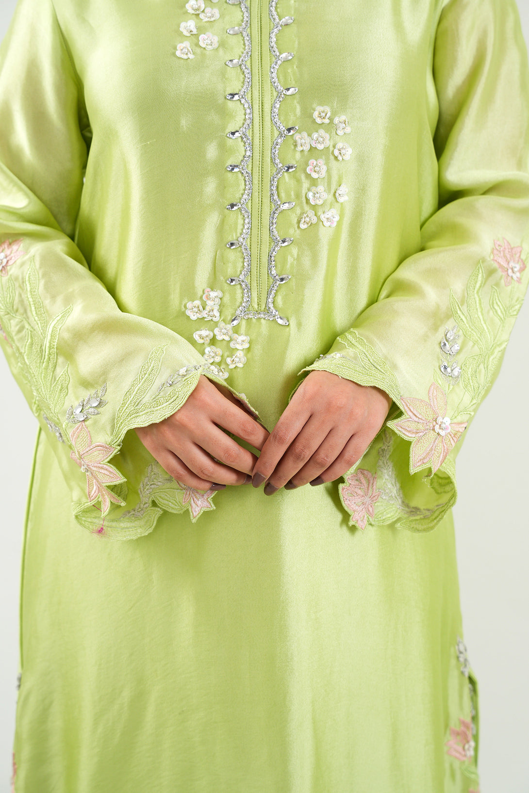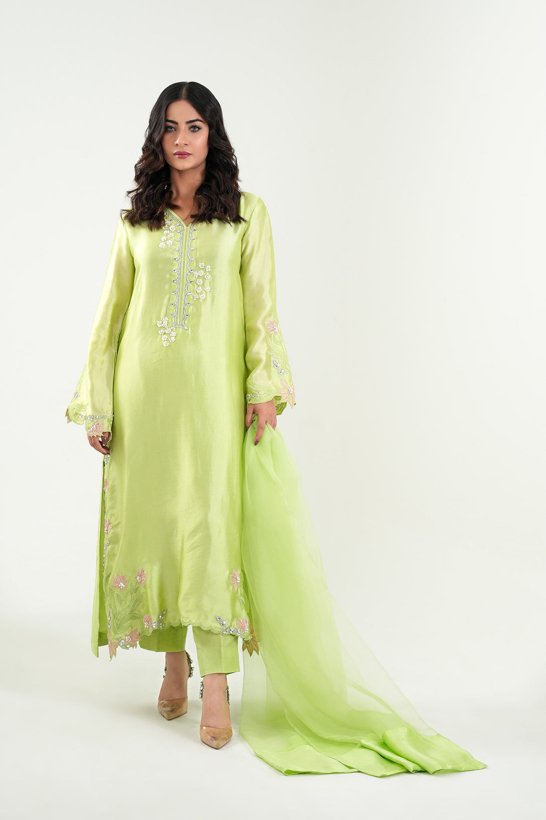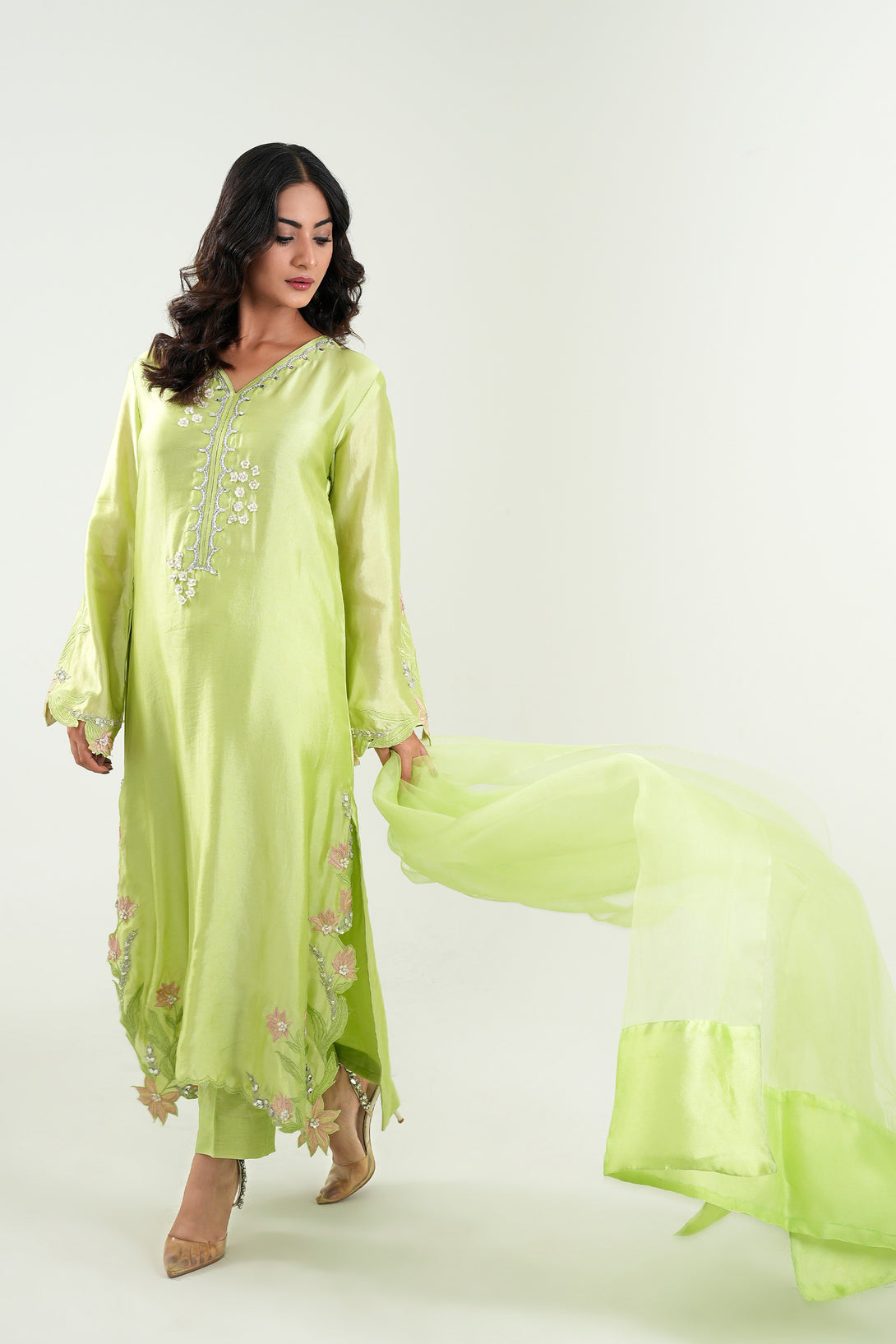 A lime green sheesha silk, long shirt, embroidered with appliqué and crystal work.paired with Korean rawsilk pants and an organza dupatta.