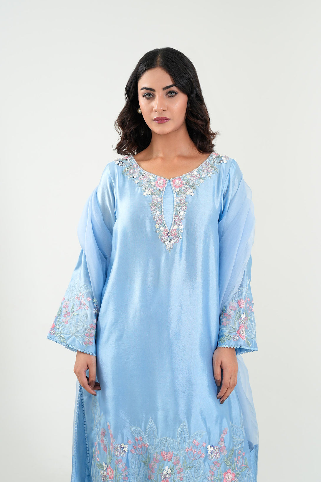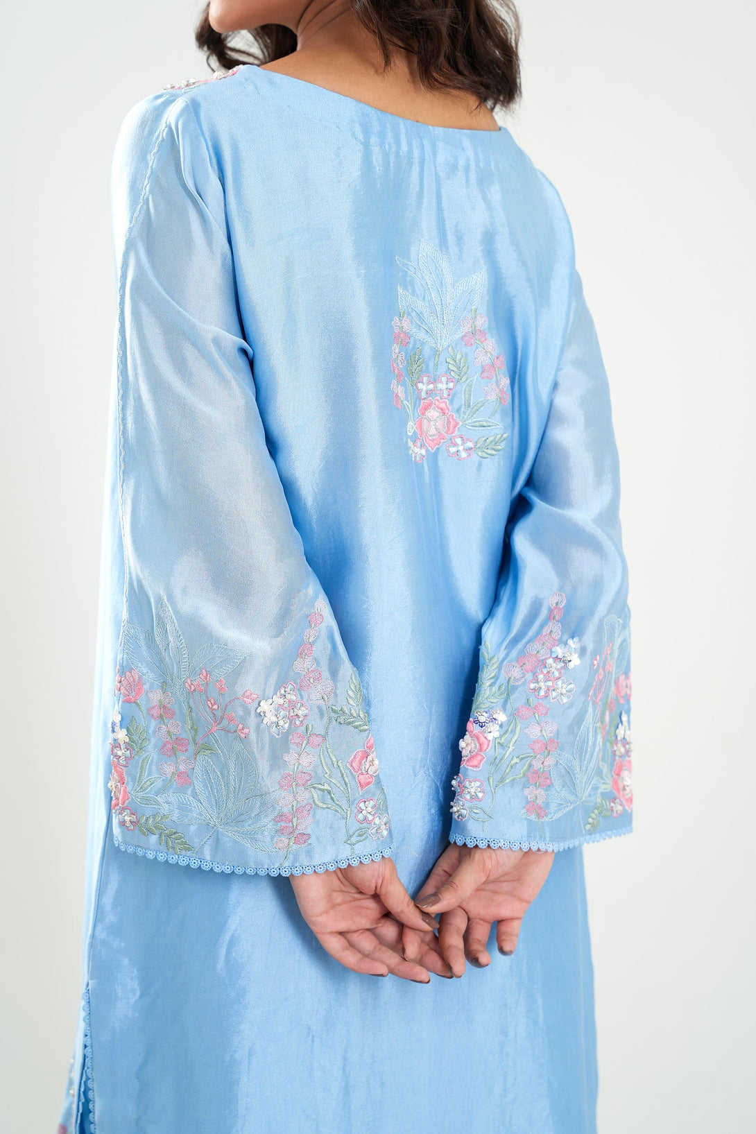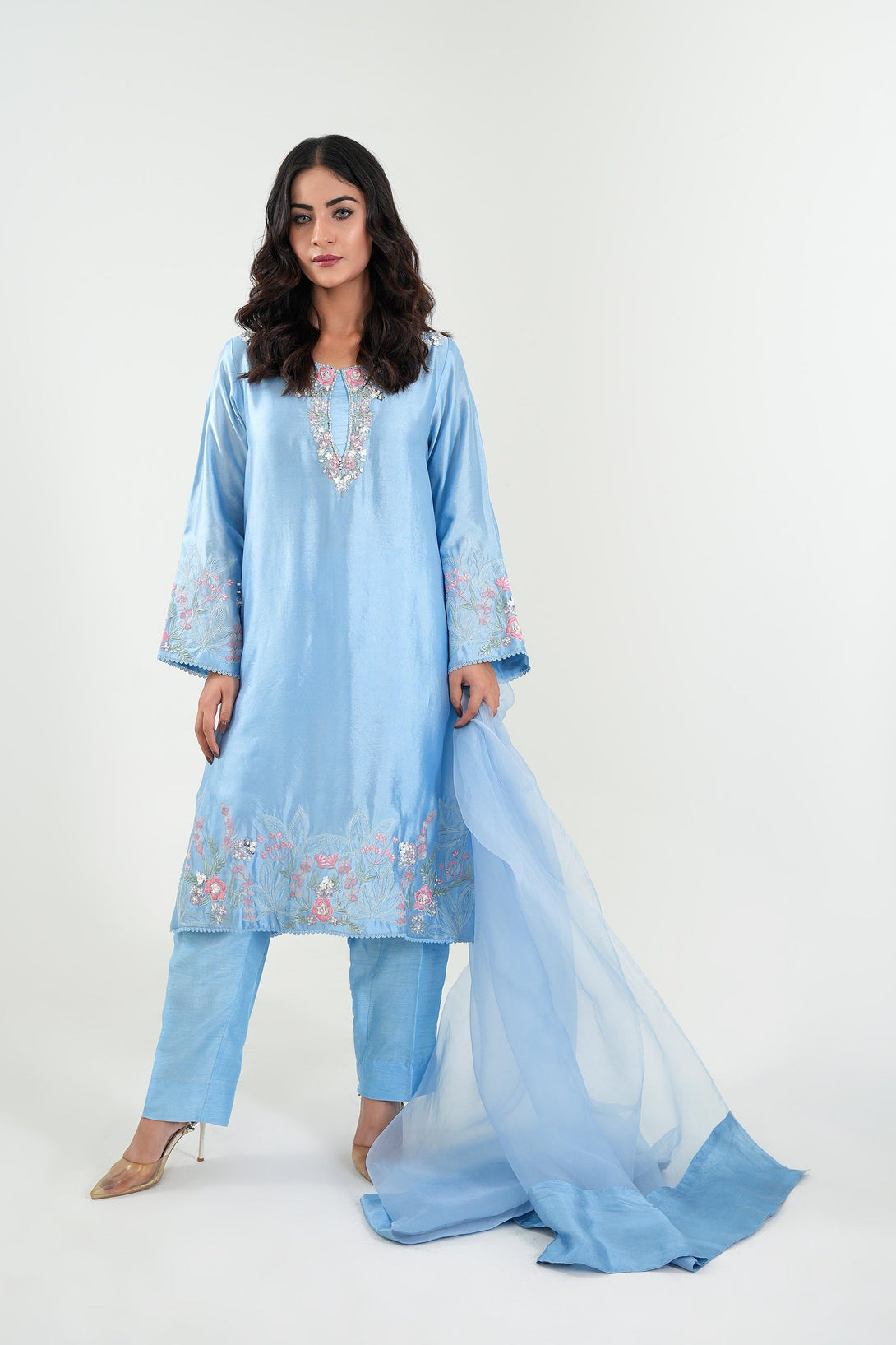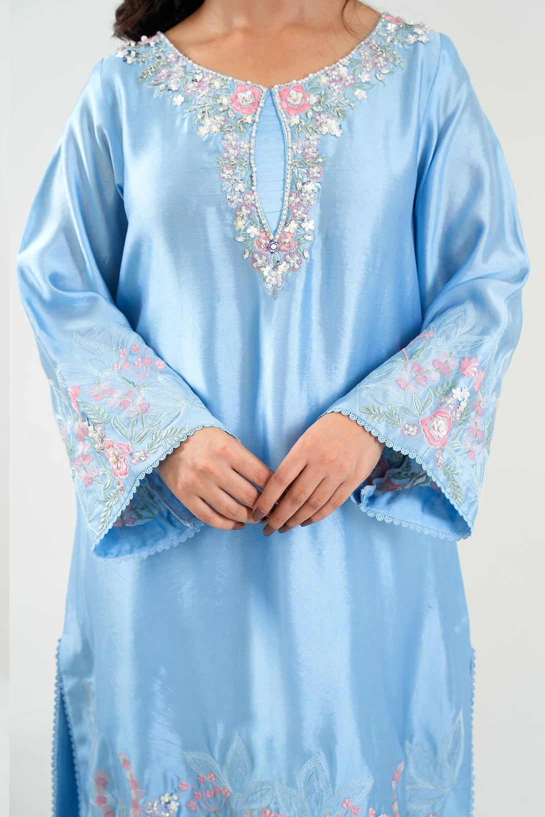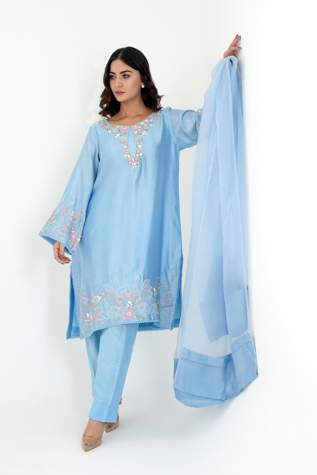 A short shirt, worked with embroidery and pearl details, along the hem and sleeves. Paired with Korean rawsilk pants and an organza dupatta.